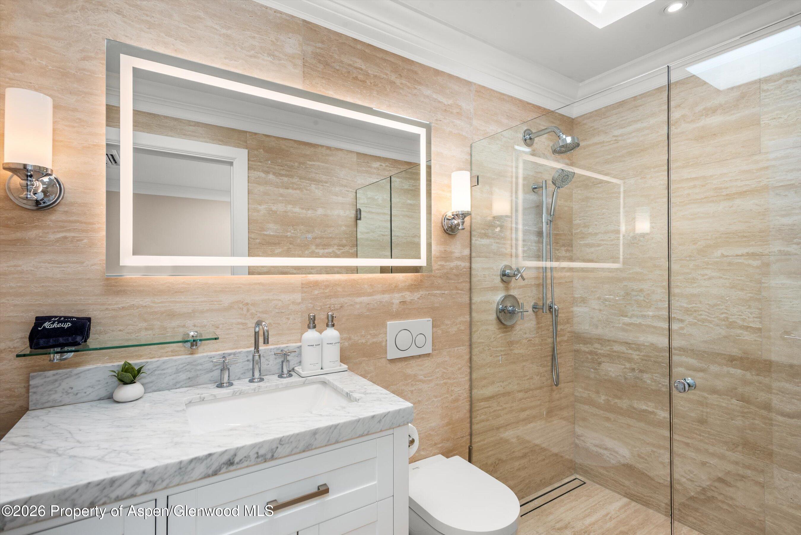 The primary suite, complete with an ensuite bathroom, is privately situated on the upper level. Two additional bedrooms and a shared bathroom are located on the main level, with both bathrooms finished in timeless travertine floors and walls.