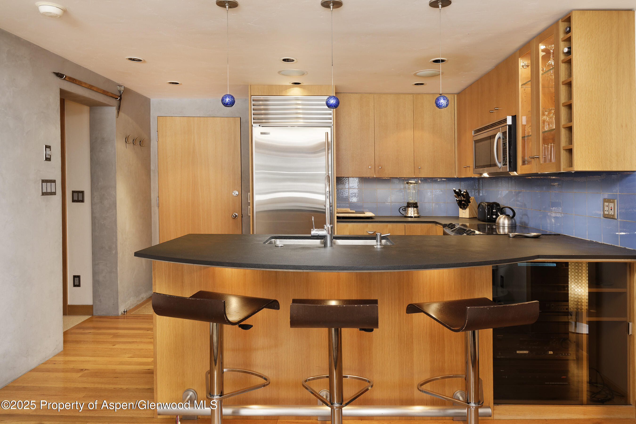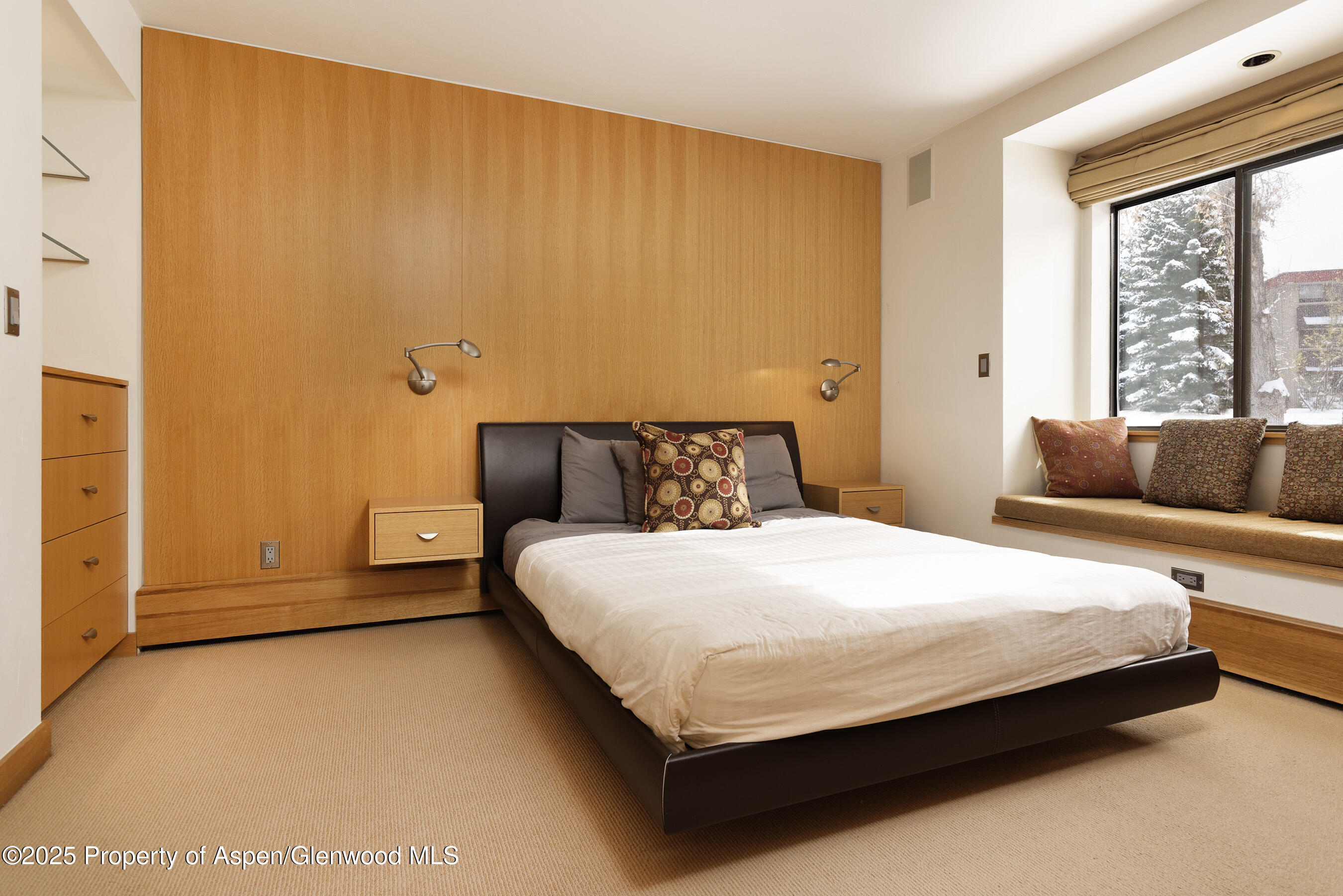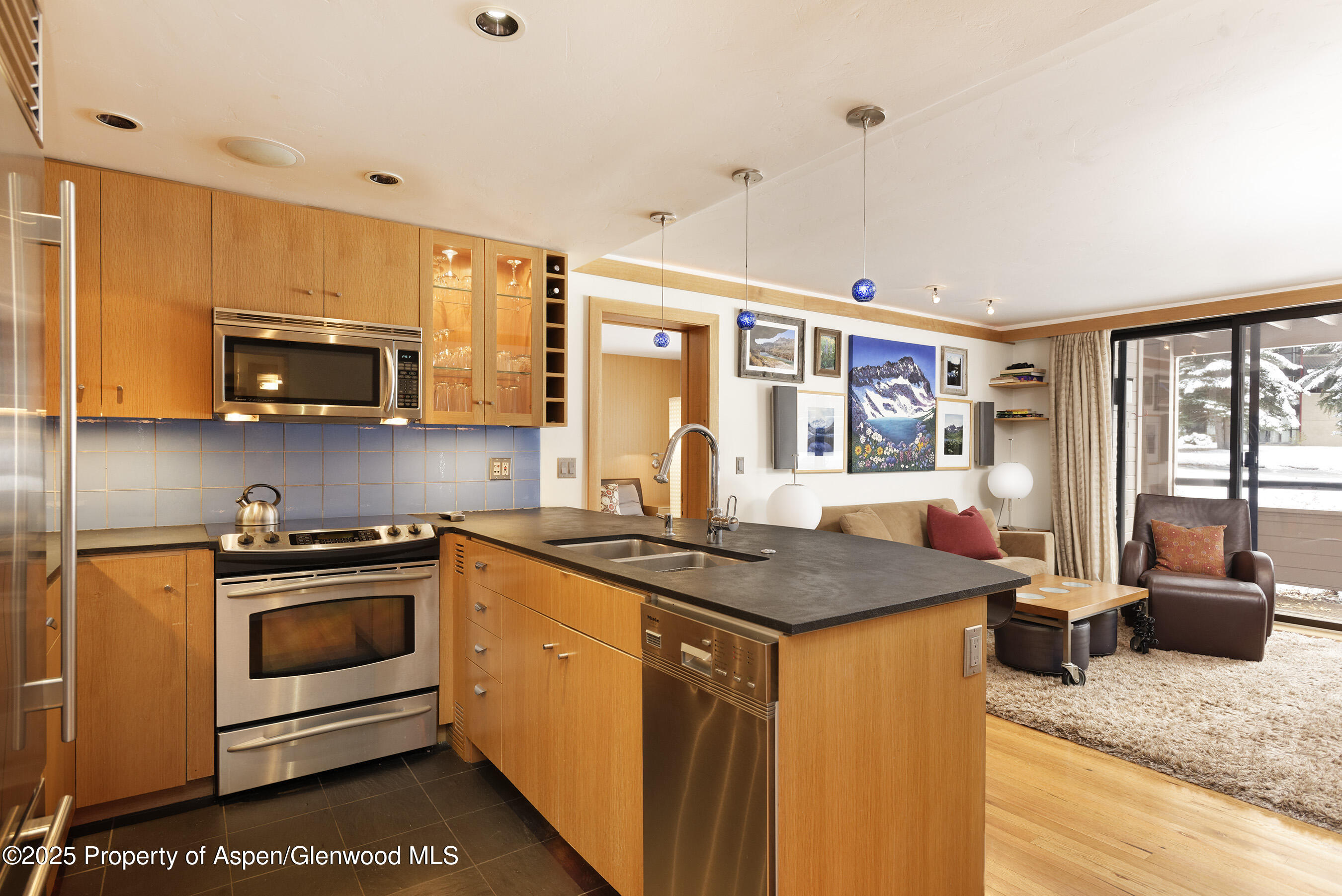 This 2-bedroom, 2-bathroom Hunter Creek unit is located on the ground floor in the 4 Building. Walk-out unit, featuring great views of Aspen Mountain and Buttermilk. An expansive lawn that deflects the parking lot in the front. There is a jacuzzi tub and steam shower in the guest room and stall shower with 5 heads in the Primary bedroom. Lots of closet space - offered fully furnished. Unit is a high end custom remodel with wood paneling and bamboo built-ins. Wood and slate tile floors + Sub Zero and Miele appliances. Utilities are included!